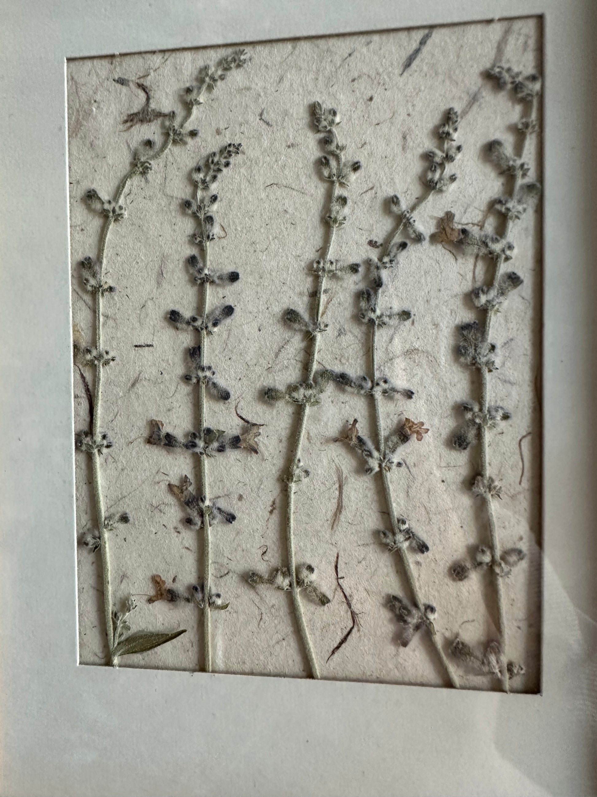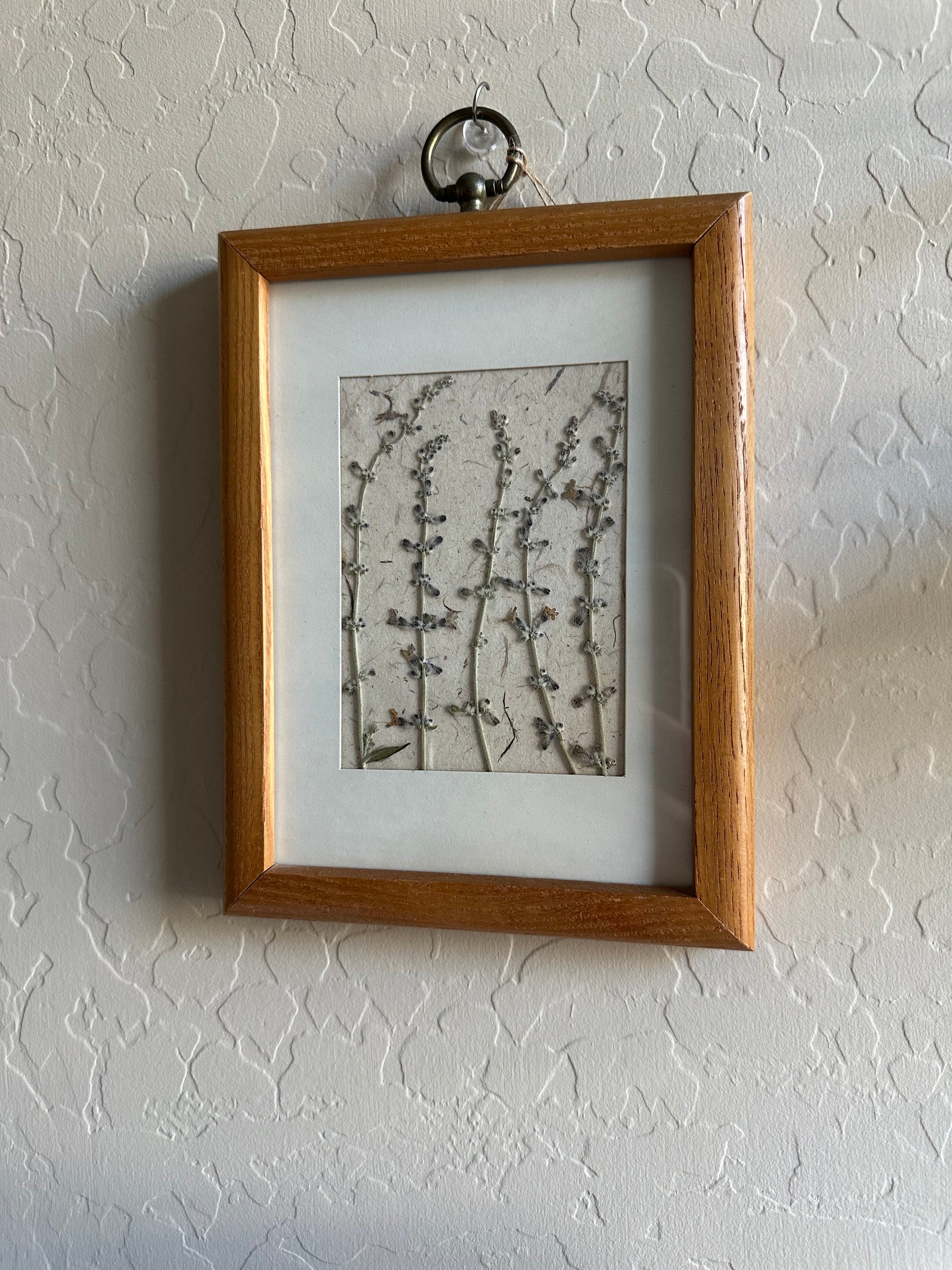 This vintage wooden cottage core frame features lavender. This frame hangs on the wall only and measures approximately 5x7